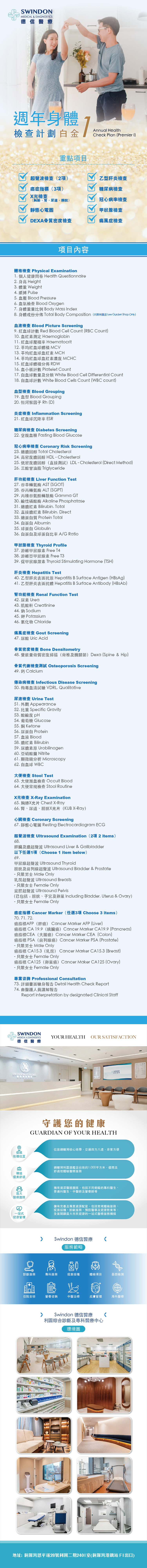 • Highlighted Items﹕ Ultrasound, Cancer Makers, Resting ECG, Three-hypers, Liver, Renal, Thyroid, Urine, Stool, Hepatitis B, Infectious Disease, DEXA, X-Ray