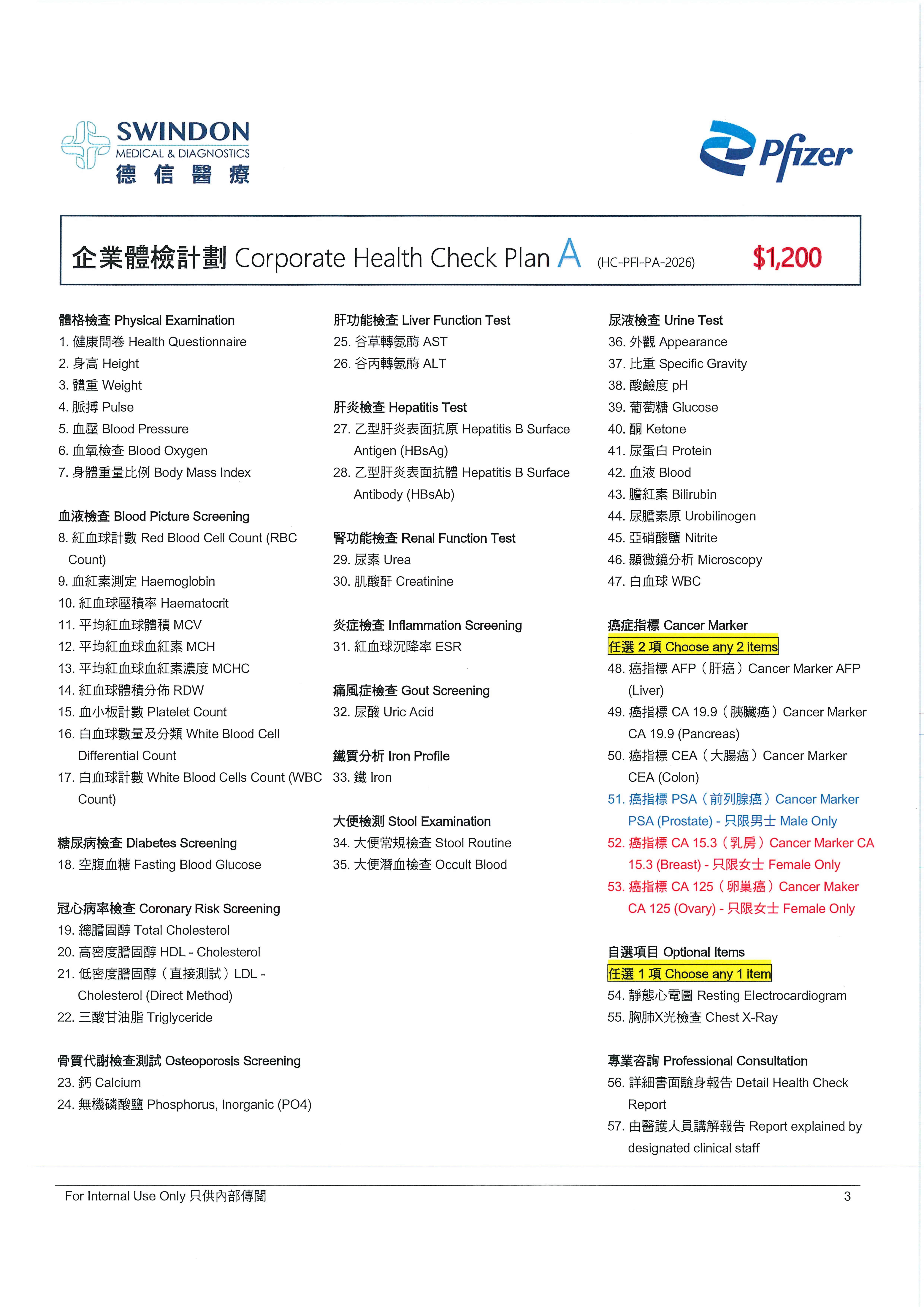 【Highlighted Items】: Cancer Markers, Liver Function Test, Hepatitis Test, Renal Function Test, Diabetes Screening, Coronary Risk Screening, Gout Screening, Iron, Inflammation Screening, Osteoporosis Screening, X-Ray Examination / Resting ECG