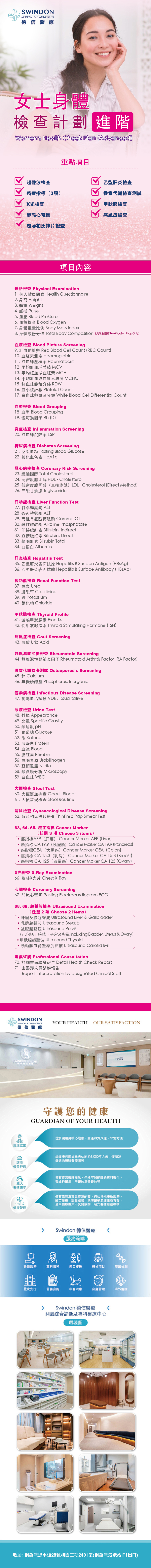 • 重點項目﹕超聲波檢查、癌症指標、X光檢查、靜態心電圖、超薄柏氏抹片檢查、乙型肝炎檢查、骨質代謝檢查測試、甲狀腺檢查、痛風症檢查