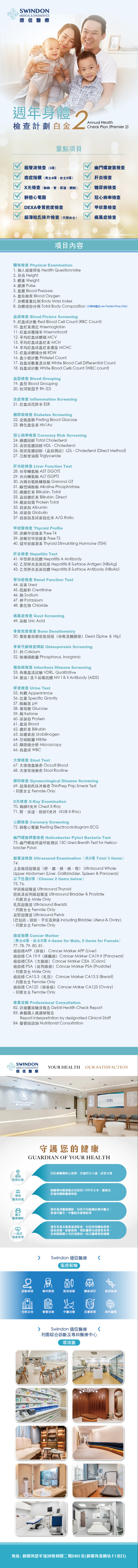• Highlighted Items﹕ Ultrasound Examination, Cancer Markers, X-Ray Examination, Resting ECG, DEXA, ThinPrep Pap Smear Test, Helicobacter Pylori Bacteria Test, Hepatitis Test, Diabetes Screening, Coronary Risk Screening, Thyroid Profile, Gout Screening