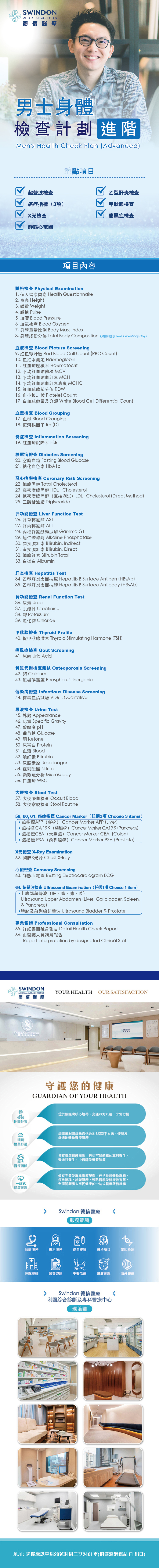 • 重點項目﹕超聲波檢查、癌症指標、X光檢查、靜態心電圖、乙型肝炎檢查、甲狀腺檢查、痛風症檢查